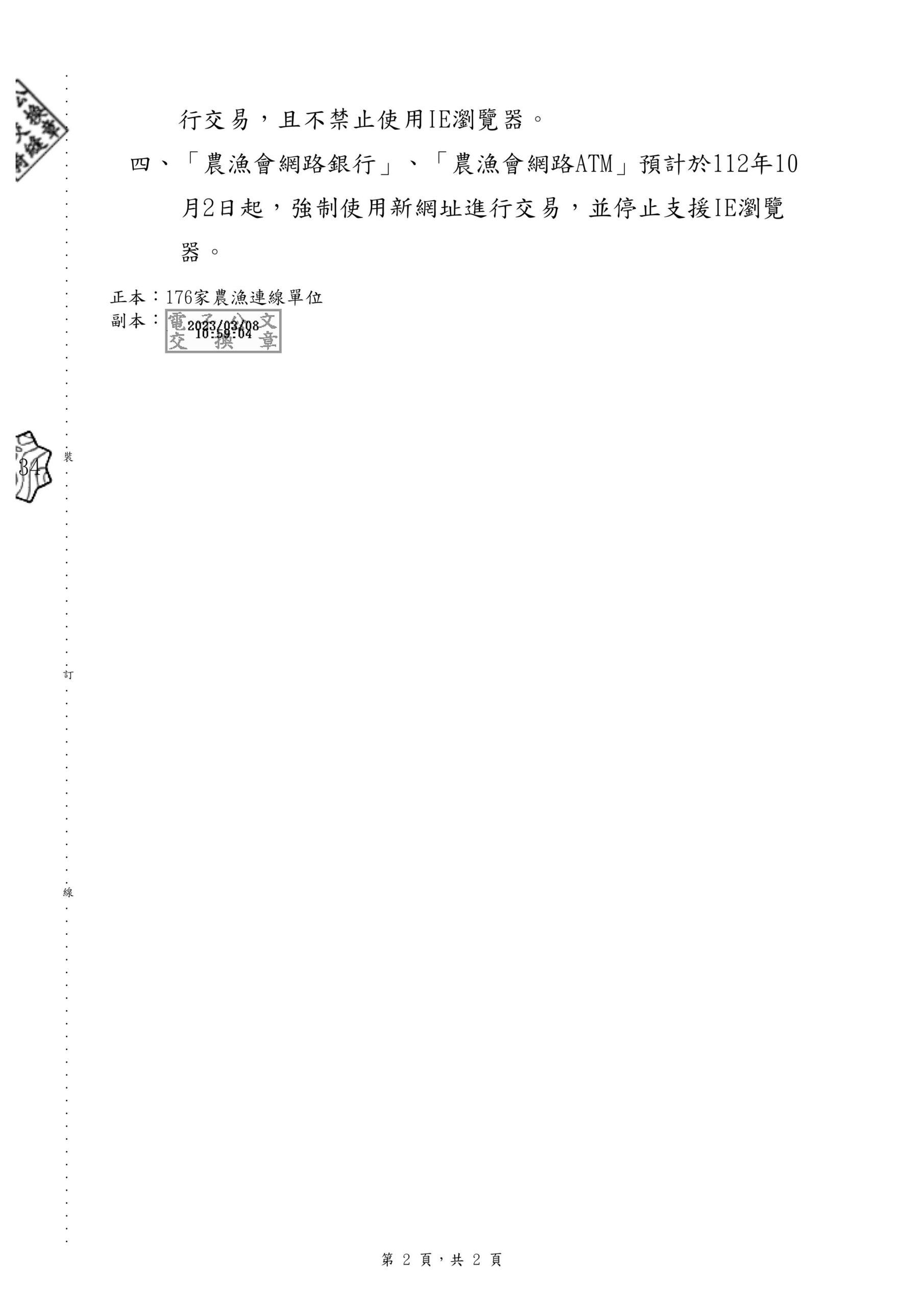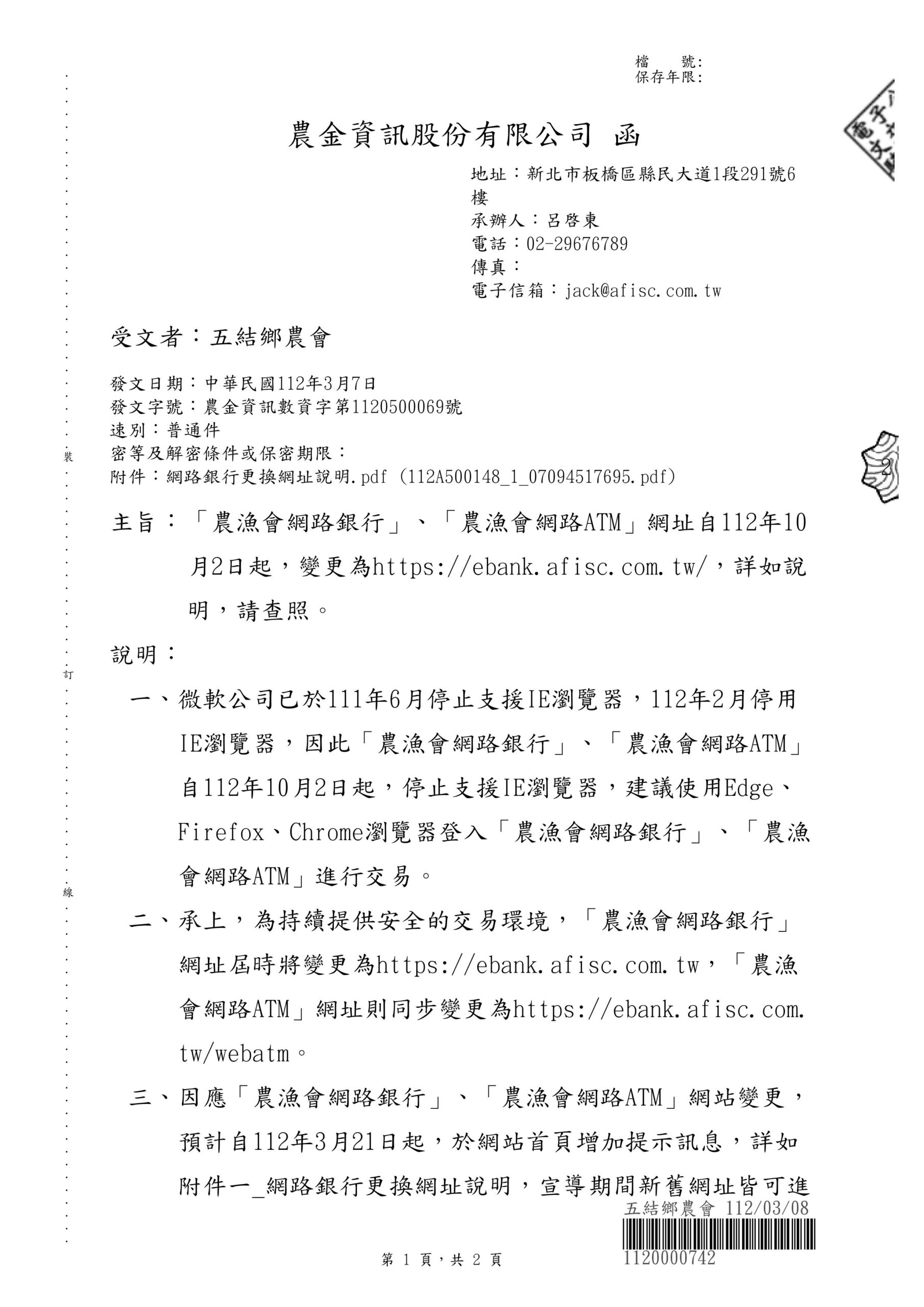 信用部, 最新消息【信用部】「農漁會網路銀行」、「農漁會網路ATM」網址自112年10 月2日起,變更為https://ebank.afisc.com.tw Posted on 13 3 月, 20235 5 月, 2025 by herotin 13 3 月 【信用部】信用部實施基準利率暨指數型房貸指標利率作業準則 【信用部】農漁業者申請政策性農業專案貸款延期還款
