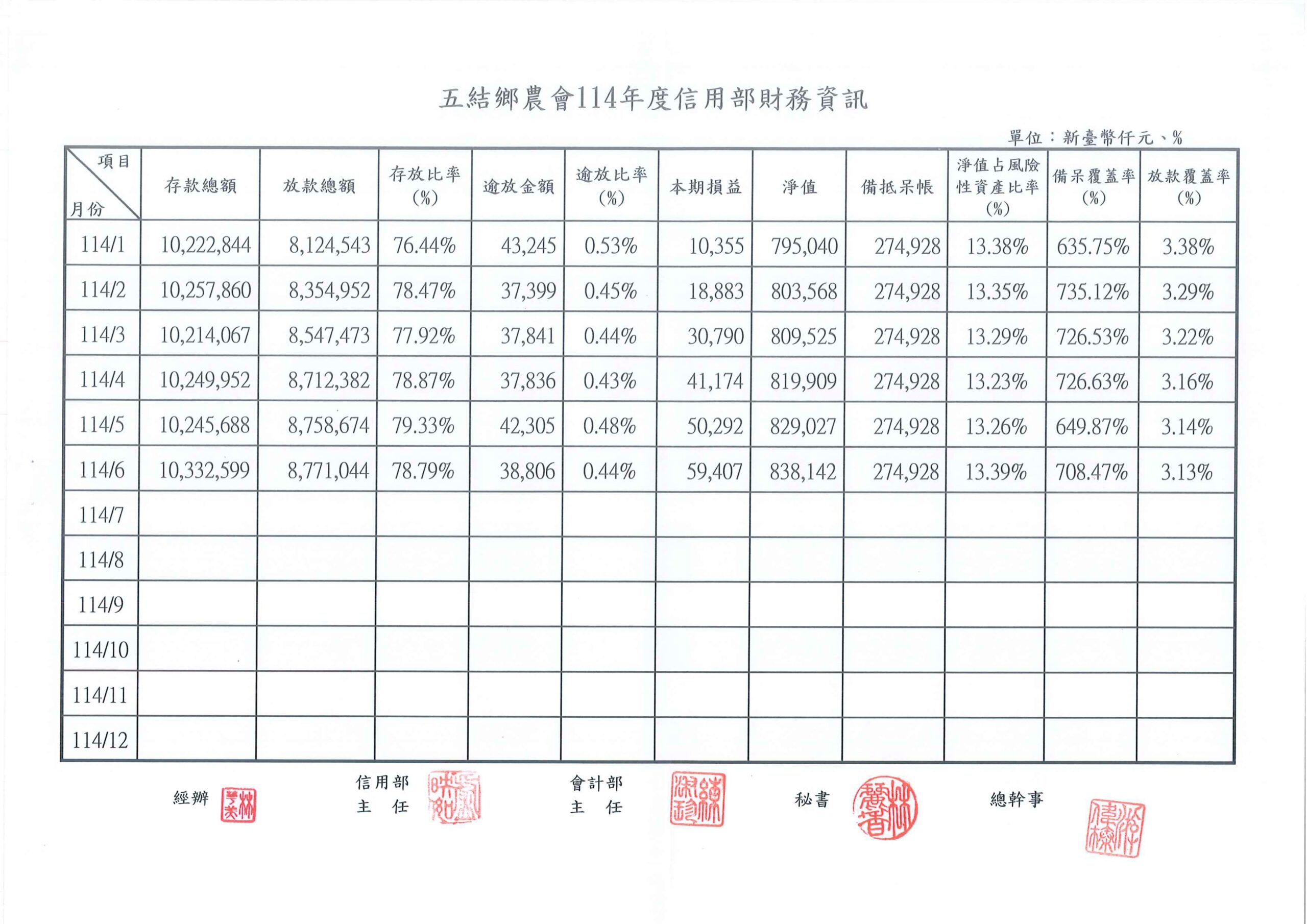 【信用部】五結鄉農會信用部財務資訊114年6月止